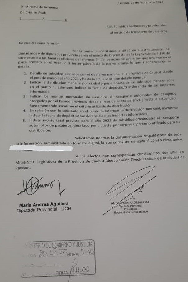 El bloque de diputados provinciales de la UCR que preside Manuel Pagliaroni e integra María Andrea Aguilera presentó este viernes un pedido de información al ministro de Gobierno del Chubut, Cristian Ayala, para conocer los montos otorgados en 2021 en concepto de subsidios nacionales y provinciales al servicio de transporte de pasajeros, así como los que se destinarán durante este 2022.