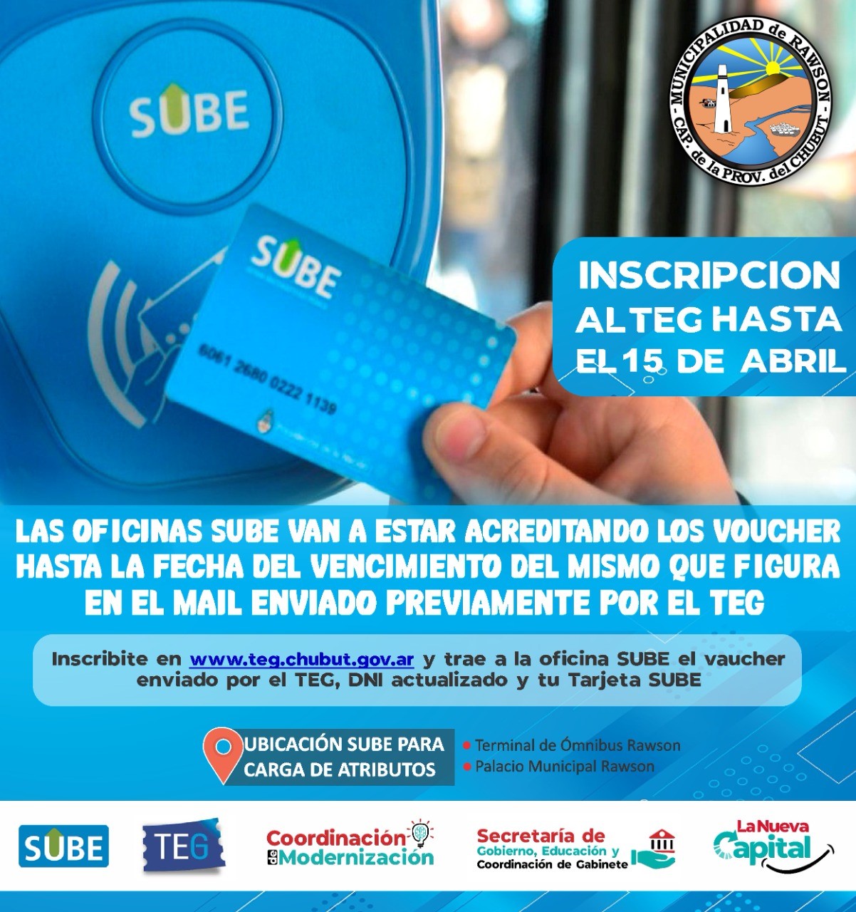La secretaría de Gobierno, Educación y Coordinación de Gabinete informó que las oficinas SUBE que se encuentran en el palacio municipal están habilitadas para acreditar el TEG. La inscripción para acceder al Boleto Estudiantil será hasta el 15 de abril a través de la página web.