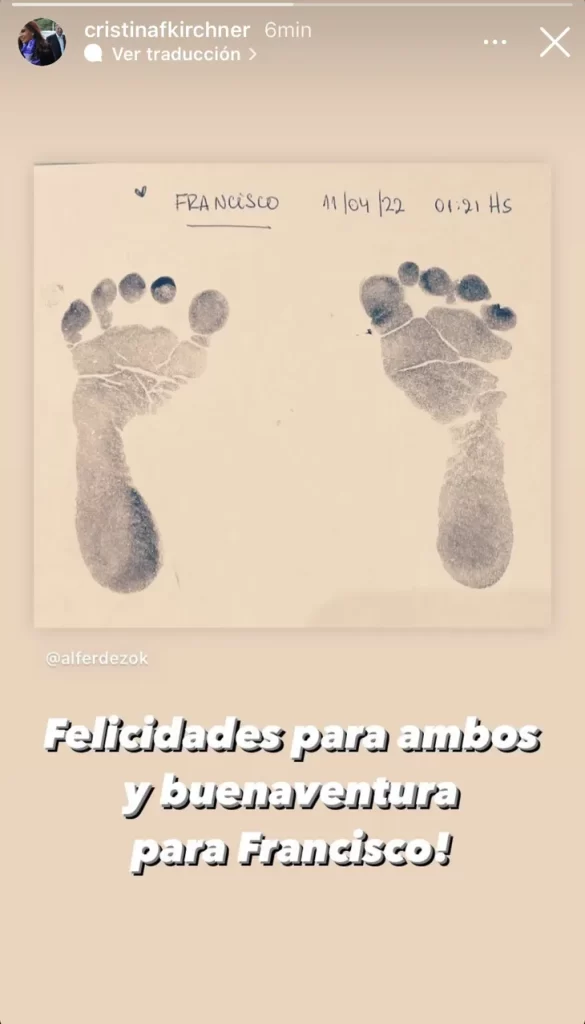 Acompañó su posteo con una frase dedicada a Alberto Fernández y a la mamá del bebé, la primera dama Fabiola Yañez. En el mensaje la vicepresidenta expresó: “Felicidades para ambos y buenaventura para Francisco!”, publicó en sus redes.