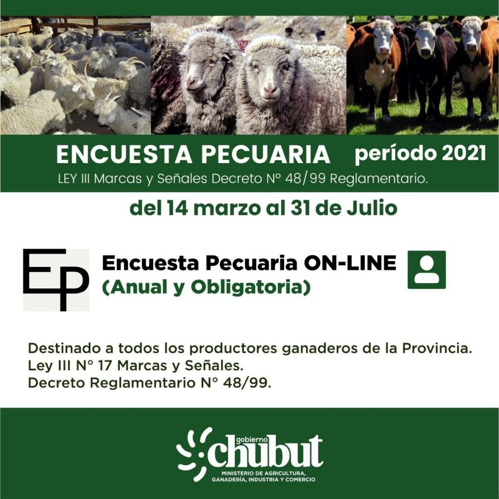 El Gobierno Provincial, a través del Ministerio de Agricultura, Ganadería, Industria y Comercio encabezado por Leandro Cavaco, recuerda a productores y productoras que tengan alguna actividad pecuaria completar la Encuesta en su modalidad online, a través del sitio web www.dgrchubut.gov.ar, donde informarán el periodo correspondiente al año 2021 ingresando con usuario y clave fiscal, hasta el 31 de julio.