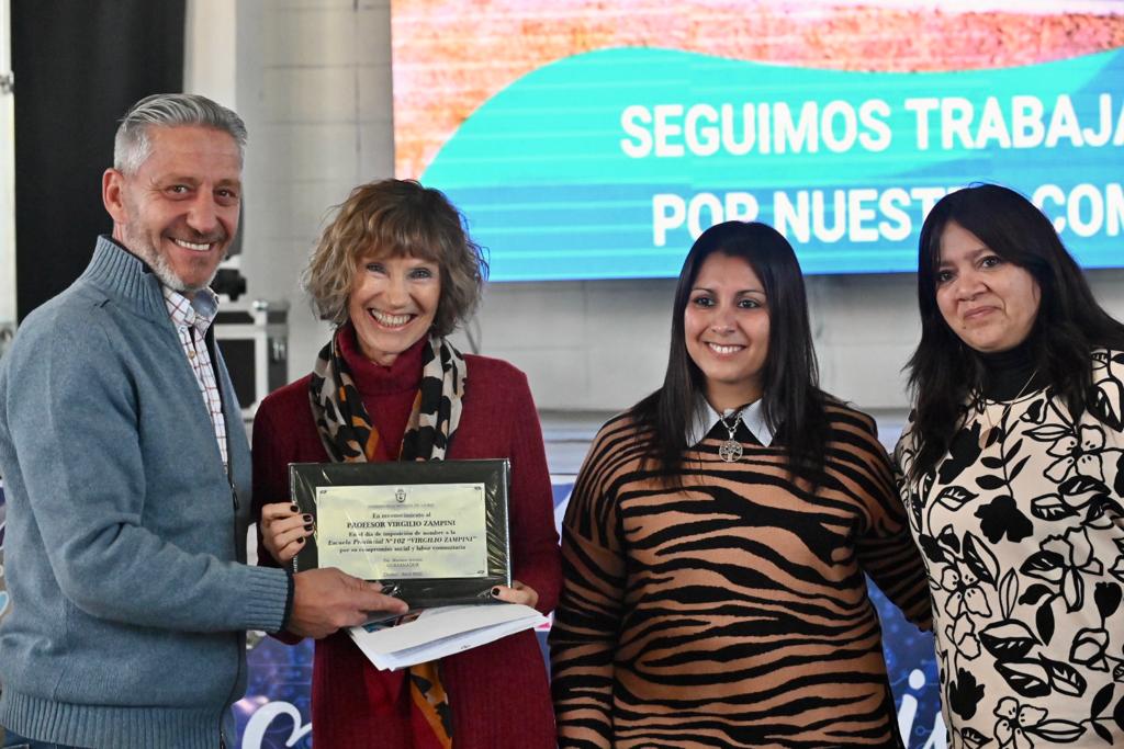 Durante el acto principal, realizado en el Gimnasio Comunal, Arcioni manifestó: “Estoy feliz de estar nuevamente aquí, de que nos acompañe ‘Mery’ en estos 109 años y que la escuela tenga el nombre de tu padre, Virgilio Zampini, por toda la historia que uno leyó, quiero felicitar a toda la comunidad en especial a la Ministra Perata, junto con Juana Rodríguez, que tomaron esta decisión y fue más que acertada, es un justo reconocimiento para esos pobladores que hicieron mucho por engrandecer nuestras pequeñas localidades”.