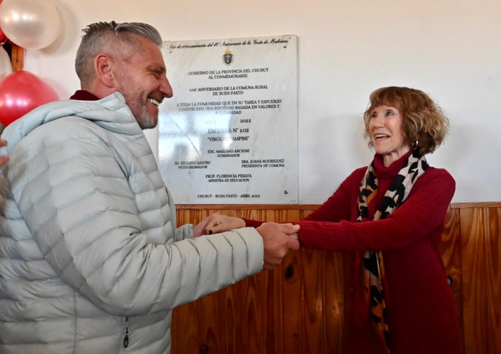 Arcioni señaló además que “la escuela secundaria va a tener las instalaciones que se merece porque se va a reacondicionar, las viviendas, los adoquines. Buen Pasto está maravilloso, te quiero felicitar por el trabajo y por esa impronta que día a día se tiene que llevar adelante”.