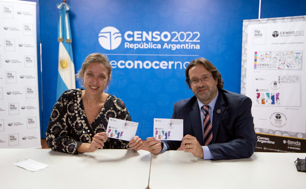 El director del INDEC, Marco Lavagna, y la presidenta del Correo Argentino, Vanesa Piesciorovski, encabezaron la presentación oficial de la emisión filatélica del Censo 2022. El sello postal conmemorativo estará disponible desde el próximo viernes en todas las sucursales filatélicas del país.