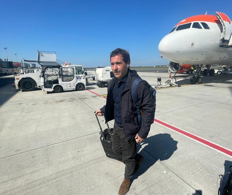 Juan Pablo Luque arribando a Francia para buscar inversiones en materia de hidrógeno.