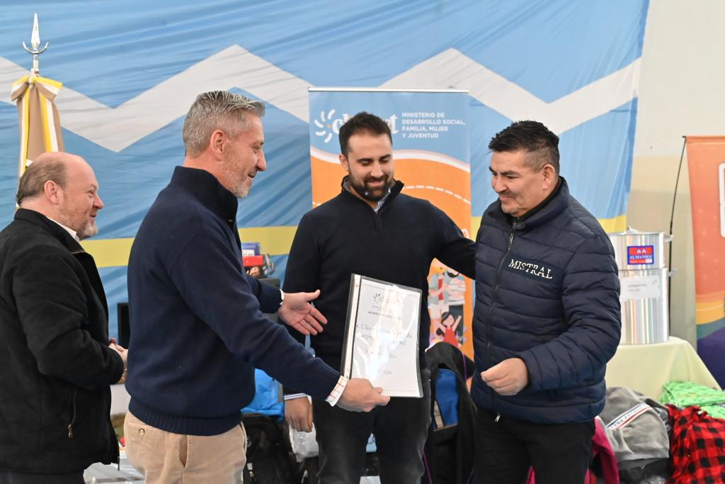 El Ministerio de Desarrollo, Familia, Mujer y Juventud entregó un aporte de 1.400.000 pesos en el marco del Plan Calor, así como distintos insumos al Municipio (frazadas, nylon, chapas, artículos de limpieza, rollos de tela, guardapolvos, útiles escolares, ropa de abrigo y calzado); y cuatro rollos de tela a un taller de una cooperativa en formación integrado por 15 mujeres.