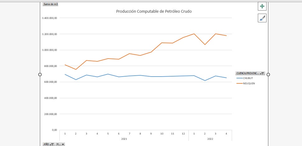 En abril de 2022 (último mes con estadísticas de la Secretaría de Energía), la cuenca neuquina consolidó 1.178.929 m3 y Chubut registró una producción de 651.547 m3 de crudo.