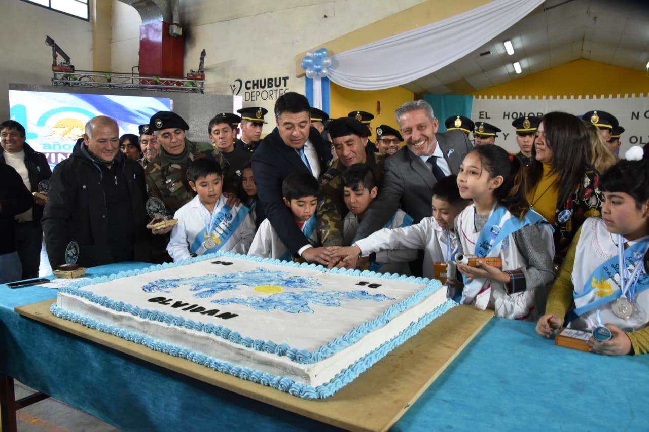 Durante el acto, el Gobernador saludo a todos los alumnos de 4º grado, a la formación de cadetes de la Policía del Chubut y a los ex combatientes. A todos ellos se les realizó la entrega de las medallas.