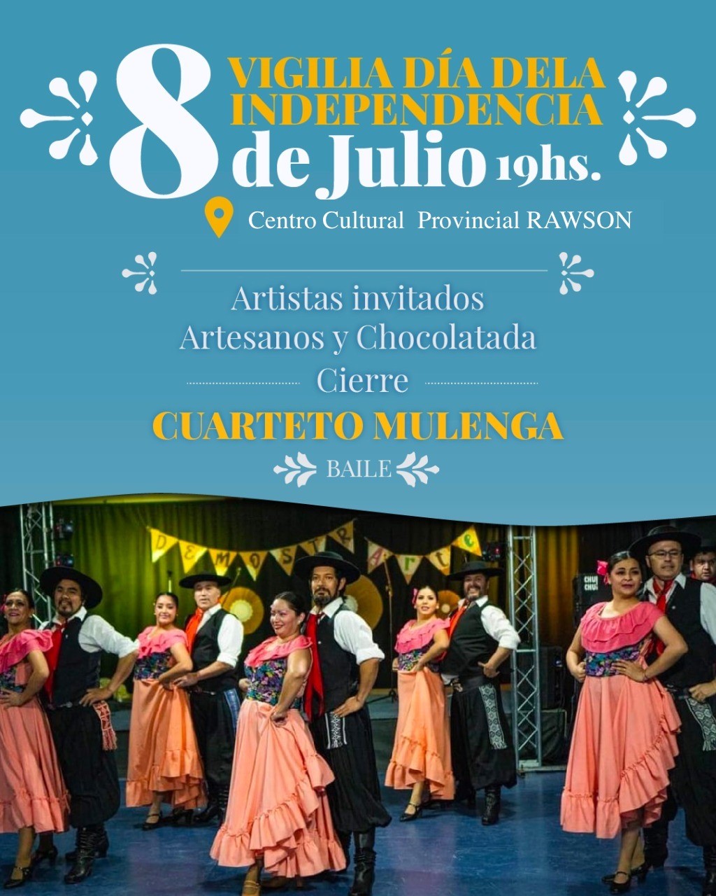 Seguidamente, a las 23.00 Cuadro folclórico, 64 bailarines de conjuntos de danzas provenientes de la ciudad de Trelew, Puerto Madryn, y Rawson, engalanarán la velada dejando plasmado toda la idiosincrasia de la mujer y el hombre chubutense, reflejando con sus atuendos la hermandad y toda la identidad en bailes como fox troc, paso doble y cielito de la independencia.