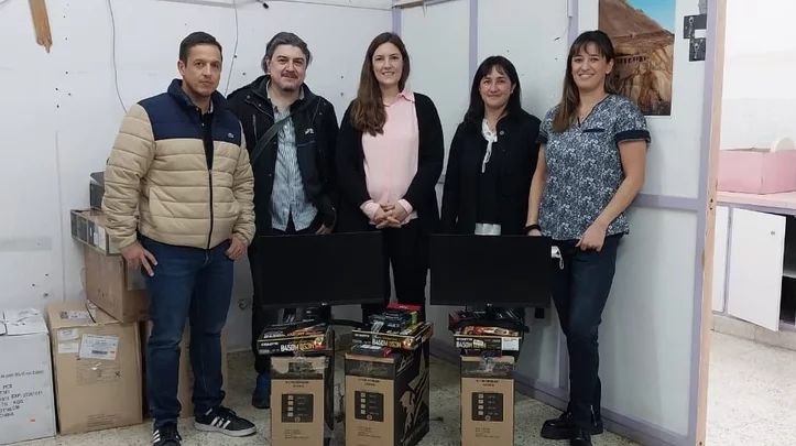 Gustavo González, titular de CAFACH junto a integrantes de la Cámara pesquera, hicieron entrega a la titular de la institución, Dra. Paula Morale y a integrantes de la Cooperadora, de computadoras de escritorio y mobiliario para el área de internación del Hospital.