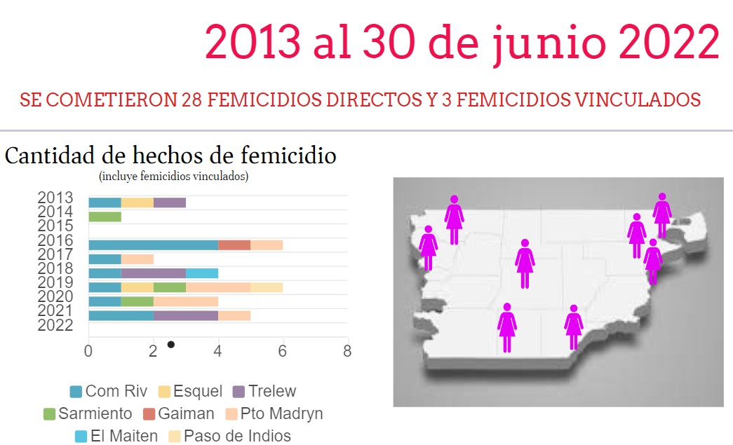 De acuerdo al informe estadístico elaborado por la Oficina de la Mujer y Violencia de Género del Superior Tribunal de Justicia de Chubut, entre el año 2013 y el 30 de junio de 2022 se han registrado en el territorio provincial un total de 28 femicidios directos y tres femicidios vinculados, cuyas causas en su mayoría, ya cuentan con condena, mientras que otros autores están con prisión preventiva efectiva a la espera de juicio.