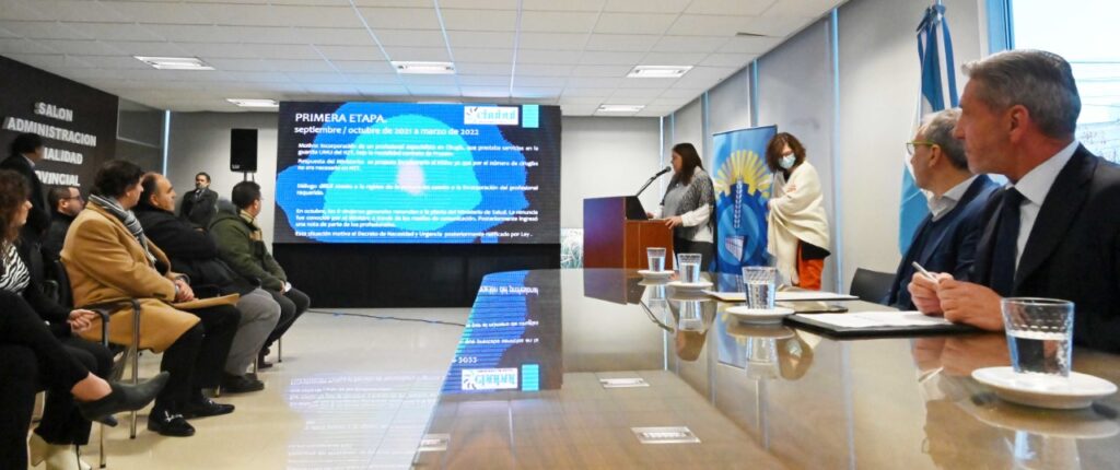 El acto se desarrolló en el salón de la Administración de Vialidad Provincial (AVP), donde el mandatario provincial estuvo acompañado por el ministro de Salud, Fabián Puratich, así como por la subsecretaria de Planificación y Capacitación, Laura Pizzi, y la asesora ministerial, la doctora Teresa Strella, quienes estuvieron a cargo de la presentación del trabajo de evaluación.