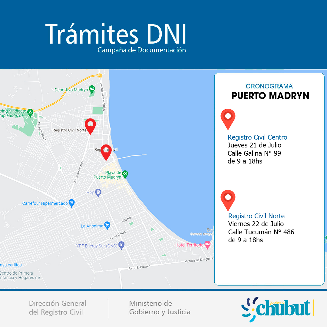 El Gobierno provincial, a través de la Dirección General de Registro Civil y Capacidad de las Personas, comenzará esta semana la Campaña de Documentación en Puerto Madryn. El equipo operativo estará trabajando el jueves 21 en el Registro Civil de zona centro, con ubicación en Galina N° 99. En tanto el viernes 22, la campaña se desarrollará en el Registro Civil de zona norte por calle Tucumán N° 486.
