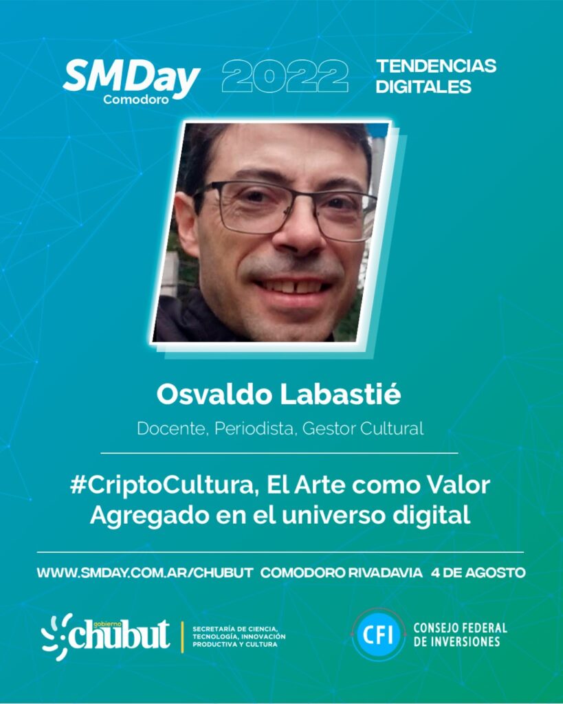 12:00 hs. Lic. Osvaldo Labastié (Docente y gestor cultural, realiza capacitaciones para la Secretaría Ciencia, Tecnología, Innovación Productiva y de Cultura del Chubut). Cripto Cultura: el arte como valor agregado en el universo digital. donde se introducirá al concepto de Industria Cultural y el contexto económico argentino. El objetivo de la charla es orientar en el desarrollo de difusión y distribución de contenidos musicales en línea. Introducir los nuevos modelos de negocios, metaverso, financiamiento colectivo, desarrollo de NFT y Web3.