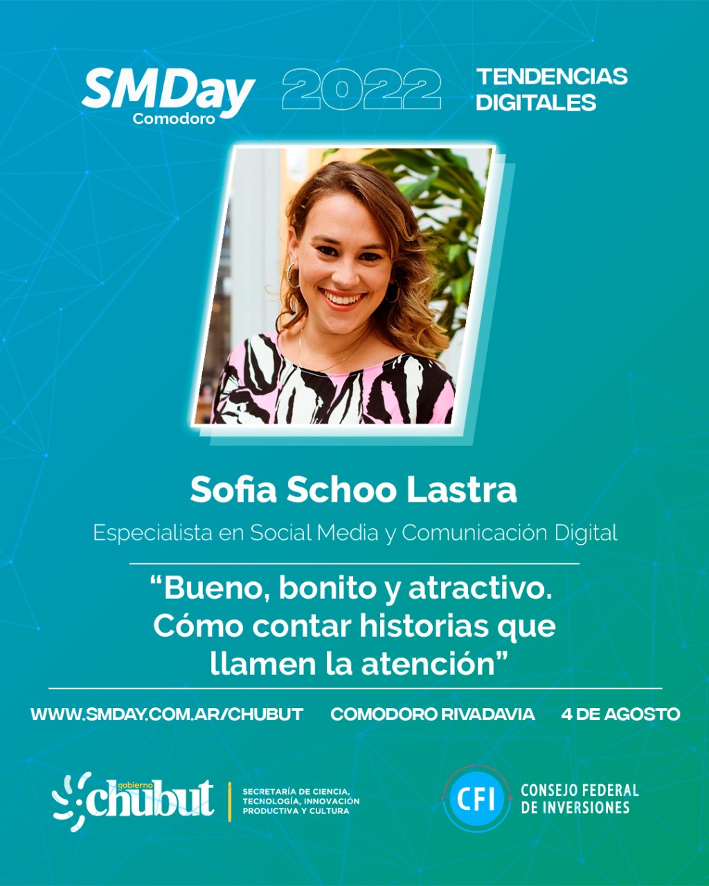 El Gobierno del Chubut, junto a la productora Digital Interactivo y con el apoyo del Consejo Federal de Inversiones (CFI), realizará este jueves 4 de agosto en Comodoro Rivadavia una nueva jornada de Social Media Day. El encuentro abordará las tendencias e innovación en medios sociales, siendo uno de los eventos referentes en la industria digital en la región.