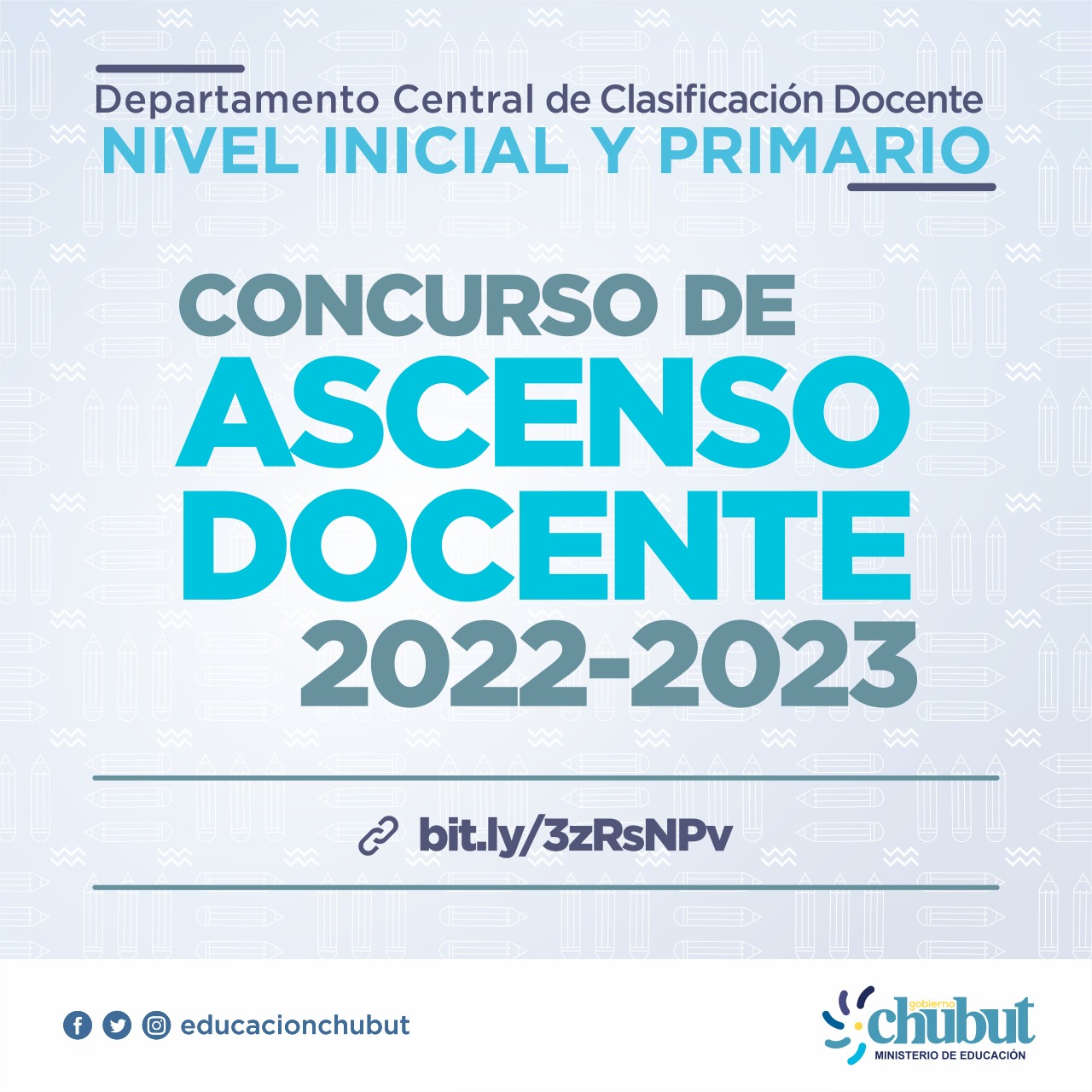 El Ministerio de Educación del Chubut, a través del Departamento Central de Clasificación Docente Nivel Inicial y Nivel Primario, convoca a Concurso de Ascenso Jerárquico para cubrir los cargos de Supervisor, Director y Vicedirector en ambos niveles, que se tramita por las siguientes resoluciones: ME Nº 615/22 – ME Nº 616/22 – ME Nº 617/22 – ME Nº 618/22.