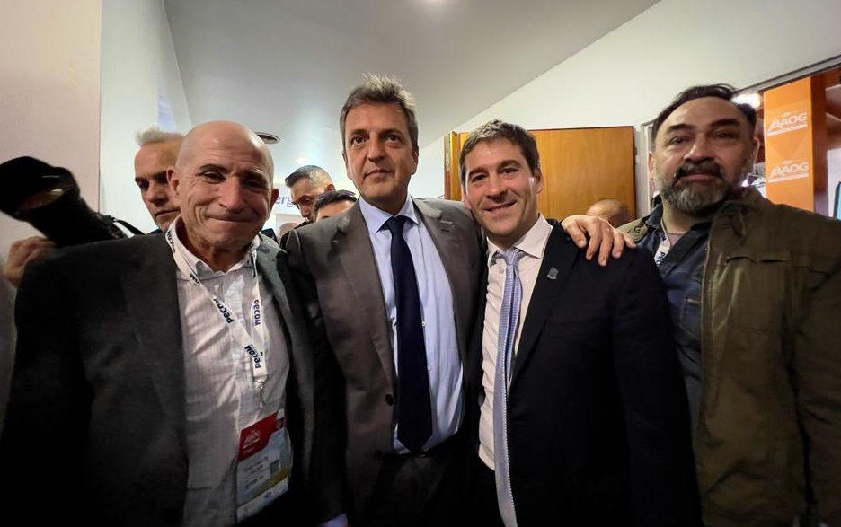 Antes que comiencen las exposiciones, el intendente de Comodoro Rivadavia, Juan Pablo Luque, junto a su ministro de Economía, Germán Issa Pfister, se mostró junto al “superministro” Sergio Massa y también con el Ministro del Interior, Wado de Pedro.