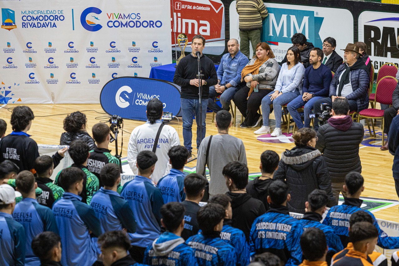 El intendente Juan Pablo Luque este sábado participó del acto de inauguración del torneo nacional de futsal que se desarrollará en Comodoro Rivadavia. Además, hubo reconocimientos a jugadores e integrantes del cuerpo técnicos campeones en los últimos años. Desde este domingo y hasta el 27 de agosto participarán 22 selecciones de diferentes puntos del país.
