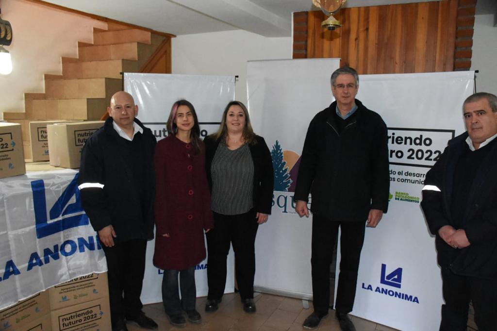 El Intendente de Esquel, Sergio Ongarato, junto al Gerente de La Anónima, Antonio Urrutía, la Secretaria de Desarrollo Social, Nadia Cittanti, la Directora de Género y Diversidad, Dra. Paula Daher Scaglioni y la profesional Sol Rshaid participaron de la entrega de módulos alimentarios destinados a mujeres y diversidades en situación de violencia por motivos de género, sostén de hogar, que tienen a cargo el cuidado de hijas/os menores de edad y que se encuentran sin empleo formal.