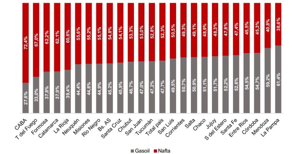 La mayor diferencia entre un combustible y el otro se da en Ciudad de Autónoma de Buenos Aires, donde hay una marcada diferencia y un fuerte predominio de las naftas súper y premium con un total de ventas del 72,4%, en tanto que el gasoil solo registró un 27,6% en el consumo total.