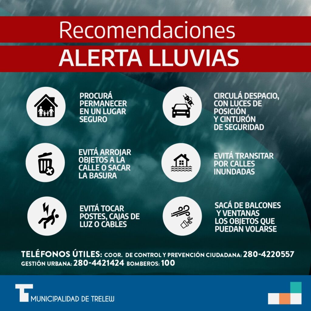 Mientras duren estas condiciones meteorológicas el Municipio solicita a los vecinos no sacar residuos voluminosos a la vía pública, evitar transitar por calles inundadas, tocar postes, cajas de luz o cables. A los automovilistas se les aconseja circular despacio con luces encendidas y el cinturón de seguridad colocado.