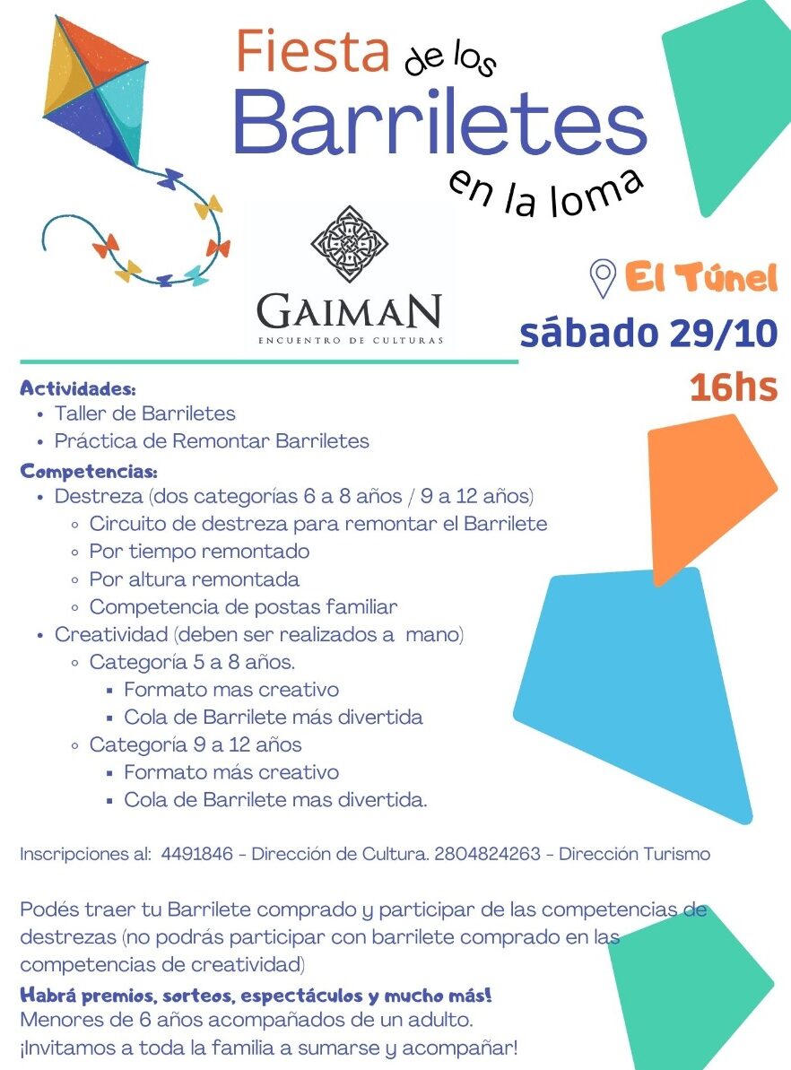 La Municipalidad de Gaiman, a través de las Direcciones de Cultura, de Turismo, y de Deportes y Recreación, realizará el sábado 29 de octubre la “Fiesta de los barriletes”, con talleres, competencias, premios, sorteos y espectáculos para disfrutar en familia.