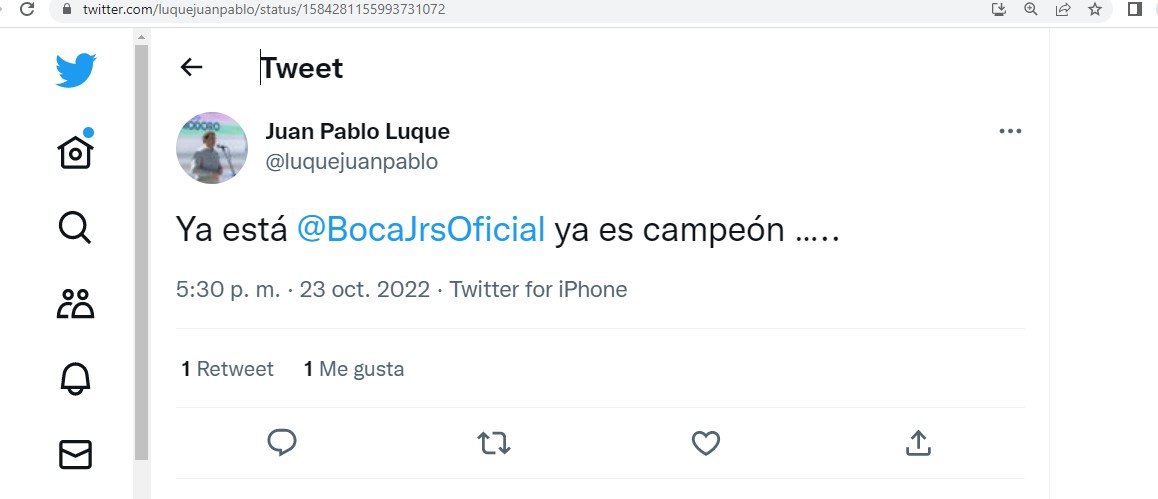 “Ya está @BocaJrsOficial ya es campeón…”, posteó Luque, declarado hincha de Racing, mientras el partido de Boca e Independiente iba 0 a 0 en el primero tiempo.