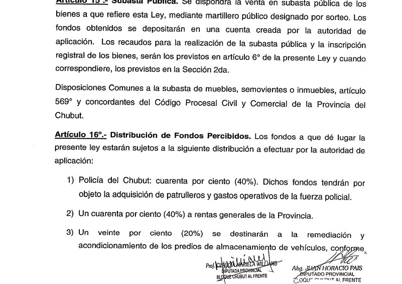 Esta vez, dos diputados oficialistas de Chubut al Frente, Juan Pais y Mariela Williams materializaron en un dossier de 33 artículos y 11 páginas las nuevas reglas para autos abandonados, perdidos, decomisados o secuestrados bajo el paraguas protector de una ley nacional y del Código Civil y Comercial.