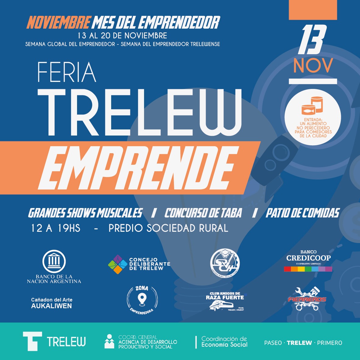 La Feria Cultural y Emprendedora “Trelew Emprende” comenzará a funcionar el domingo 13 de noviembre desde las 12 con más de 80 stands, incluyendo el Paseo Trelew Primero y el acompañamiento de instituciones privadas y entidades financieras. También habrá actividades culturales y artísticas a cargo del Cañadón del Arte, Zona Emprendedora, y los Artesanos de la Plaza Independencia.
