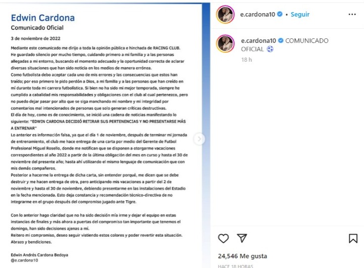 Edwin Cardona se quejó en las últimas horas desde Colombia, a donde viajó tras recibir las “vacaciones anticipadas” que le otorgó el cuerpo técnico encabezado por Fernando Gago, por esta situación de la que también hizo cargo a la dirigencia de Racing a través de un comunicado.