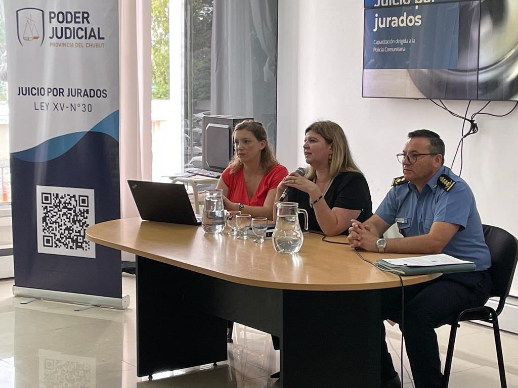 Se realizó este martes 8 de noviembre en la sede de la Jefatura de Policía del Chubut una capacitación a más de medio centenar de agentes de la Policía Comunitaria, con el fin de instruirlos en el proceso de notificación a potenciales jurados y de esa manera reforzar en las próximas semanas la tarea que llevan adelante las Oficinas Judiciales en todas las Circunscripciones Judiciales.