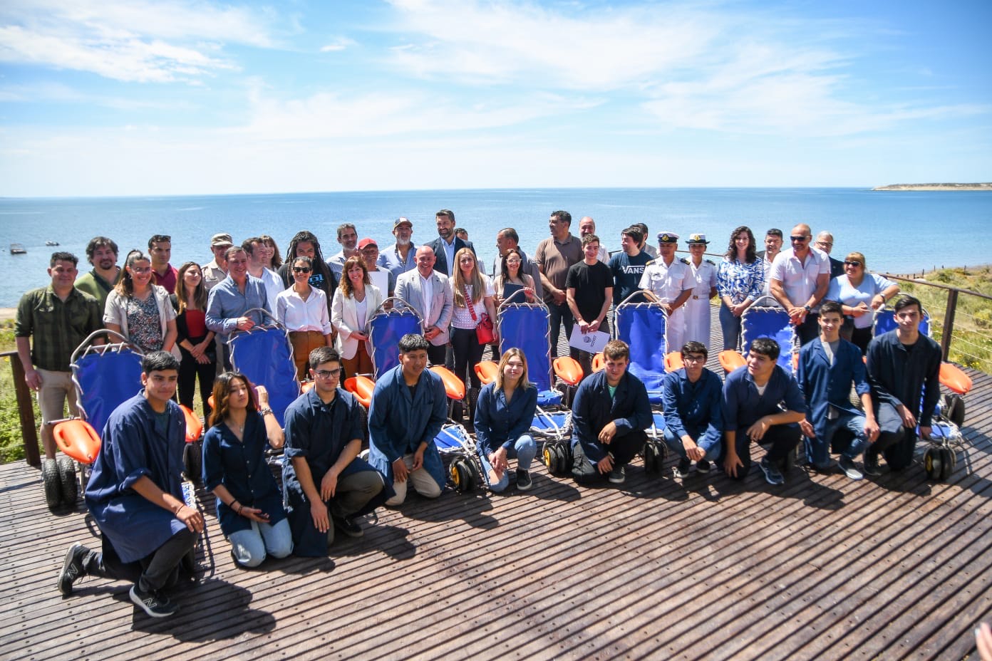 En la presentación de las sillas anfibias, Sastre estuvo acompañado por la viceintendenta Noelia Corvalán; el ministro de Turismo y Áreas Protegidas de Chubut, Leonardo Gaffet; todo el Gabinete Municipal; alumnos y autoridades de la Escuela Politécnica Nº703 “José Toschke”; referentes de Aluar; representantes de los distintos paradores y concejales de la ciudad.