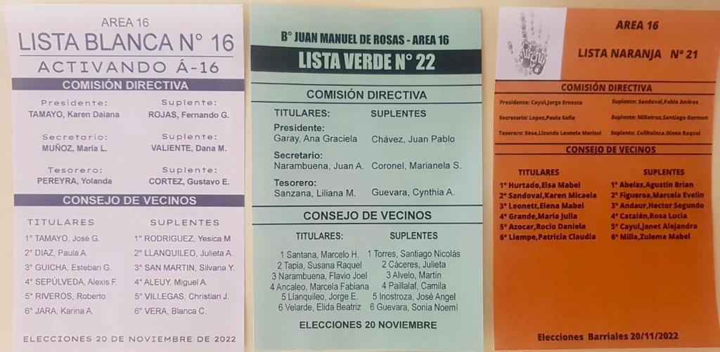 El coordinador municipal de Asociaciones Vecinales, Martín Chavero, indicó que “este domingo 20 de noviembre tendremos el acto electoral en el Área 16 con la participación de tres listas que son la Lista N°16 Blanca que postula a Karen Tamayo, la Lista N°21 Naranja que postula a Jorge Cayul y la Lista N°22 Verde que postula a Ana Garay”.
