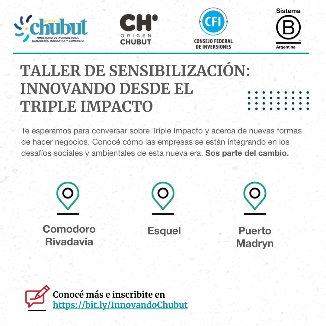 El Gobierno del Chubut -a través del Ministerio de Agricultura, Ganadería, Industria y Comercio, a cargo de Leandro Cavaco- en conjunto con Sistema B Argentina convoca a emprendedores y empresarios a participar del Taller “Innovando desde el Triple Impacto” con el objetivo de conocer sobre las tendencias de las Nuevas Economías y el rol de las empresas en la generación de impacto positivo.