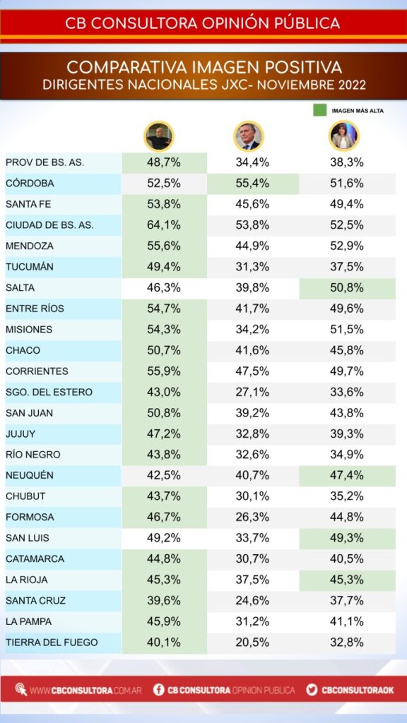 Según la última encuesta de la consultora CB, el Jefe de Gobierno de la Ciudad de Buenos Aires, Horacio Rodríguez Larreta, tiene la mejor imagen positiva dentro del PRO en la Provincia de Chubut. Rodríguez Larreta cuenta con un 43,7% de imagen positiva, por encima de Patricia Bullrich (35,2%) y con amplia ventaja sobre el ex presidente Mauricio Macri (30,1%).