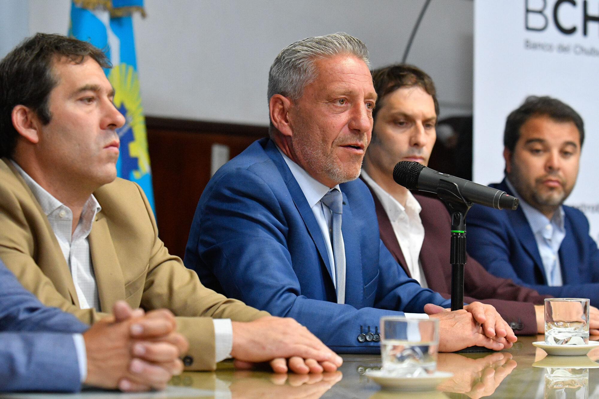 Arcioni junto con el presidente y vice del Banco Chubut, Miguel Arnaudo y Rodrigo Gaitán; el intendente municipal Juan Pablo Luque y el presidente de la Cámara, Guillermo Ceriani, procedió a la rúbrica de la permuta, que cede las instalaciones de Rivadavia 452.