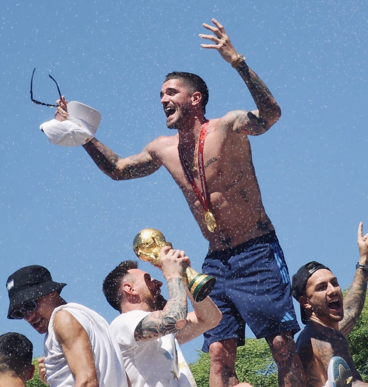 De Paul subió varias fotos con la Copa del Mundo, en compañía de Lionel Messi, Nicolás Otamendi, Ángel Di María y Exequiel Palacios, mientras a sus espaldas un grupo nutrido de hinchas buscó un saludo de sus ídolos futboleros.