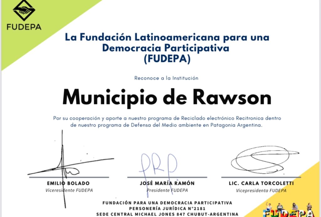 La Municipalidad de Rawson, a través de la Secretaría de Ambiente, recibió un reconocimiento por parte de la Fundación Latinoamericana para una Democracia Participativa (FUDEPA) por su trabajo con el programa de reciclado Recitrónica, impulsado por la organización, orientado a reciclar y recuperar residuos electrónicos y, en ese marco, a proteger al ambiente.