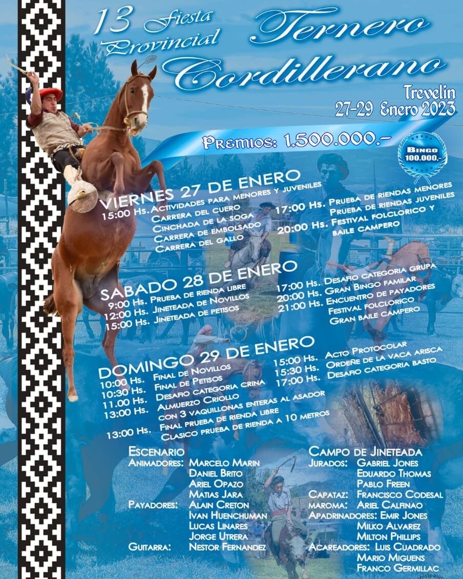 Continuando con el cronograma de Fiestas Populares 2023, el Gobierno del Chubut acompaña este fin de semana las celebraciones de la 13° Edición de la Fiesta Provincial del Ternero Cordillerano en la localidad de Trevelin y la 11° Edición de la Fiesta Provincial del Acordeón y la Guitarra en Lagunita Salada.