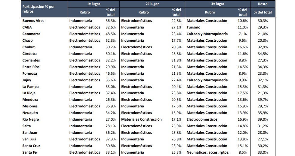 Con respecto a los rubros de mayor participación en las ventas de Ahora 12, en Chubut lideraron el ranking la indumentaria con el 30,2%.