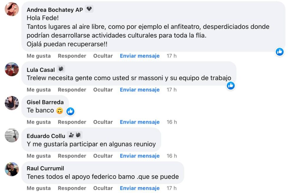 “A Trelew la vamos a sacar adelante con el trabajo y el esfuerzo de todos”, destacó Massoni durante el vivo, al responder a las múltiples expresiones de preocupación de los vecinos por el estado de abandono que sufre la ciudad.