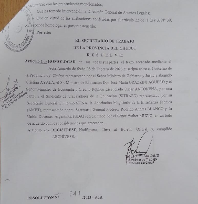 El secretario general del Sindicato de Trabajadores de la Educación (SITRAED) del Chubut, Guillermo Spina, dio a conocer que la Secretaría de Trabajo de la Provincia homologó el acta acuerdo por la cual los docentes cobrarán los montos adeudados de la paritaria del año pasado.