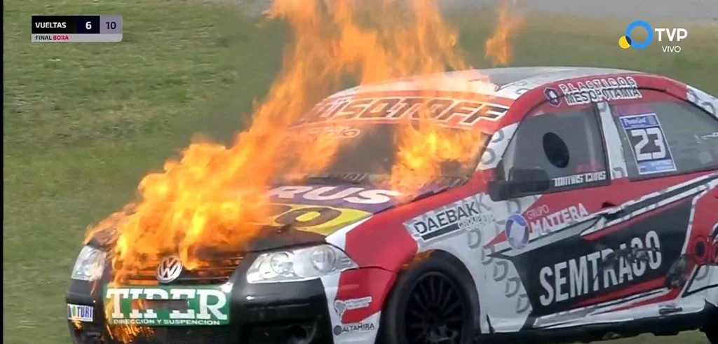 Debido a un desperfecto mecánico, el marplatense salió de pista y a los pocos metros las llamas envolvieron toda la parte delantera del auto, del que alcanzó a bajarse sin consecuencias físicas.