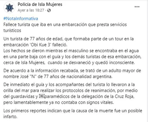 “Los hechos se desencadenaron cuando se encontraba en un sector de aguas bajas con demás turistas de la embarcación y perdió el conocimiento, explicaron guardavidas y paramédicos de la Cruz Roja”, agrega el comunicado de la Policía de Isla de Mujeres en Facebook.
