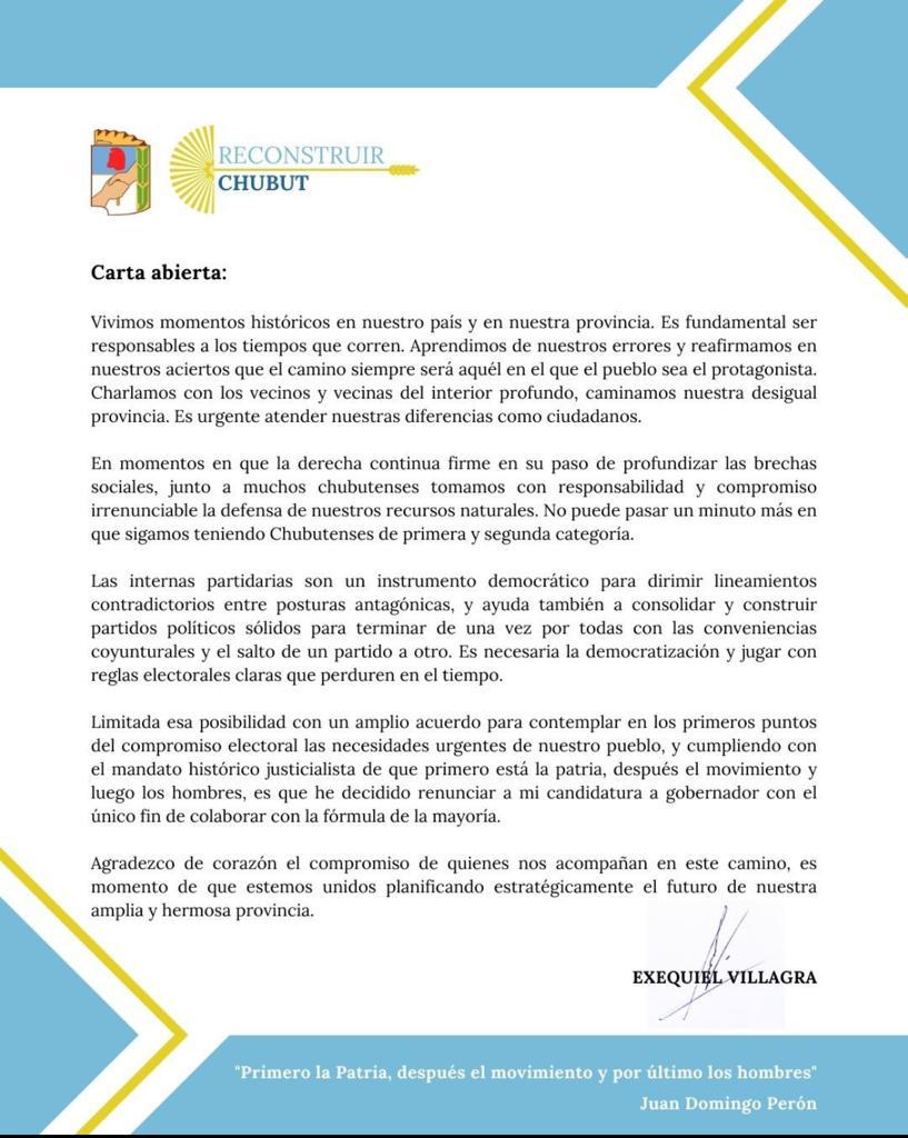 Sin embargo, explicó que “limitada esa posibilidad con un amplio acuerdo para contemplar en los primeros puntos del compromiso electoral las necesidades urgentes de nuestro pueblo, y cumpliendo con el mandato histórico justicialista de que primero está la patria, después el movimiento y luego los hombres, es que he decidido renunciar a mi candidatura a gobernador con el único fin de colaborar con la fórmula de la mayoría”.
