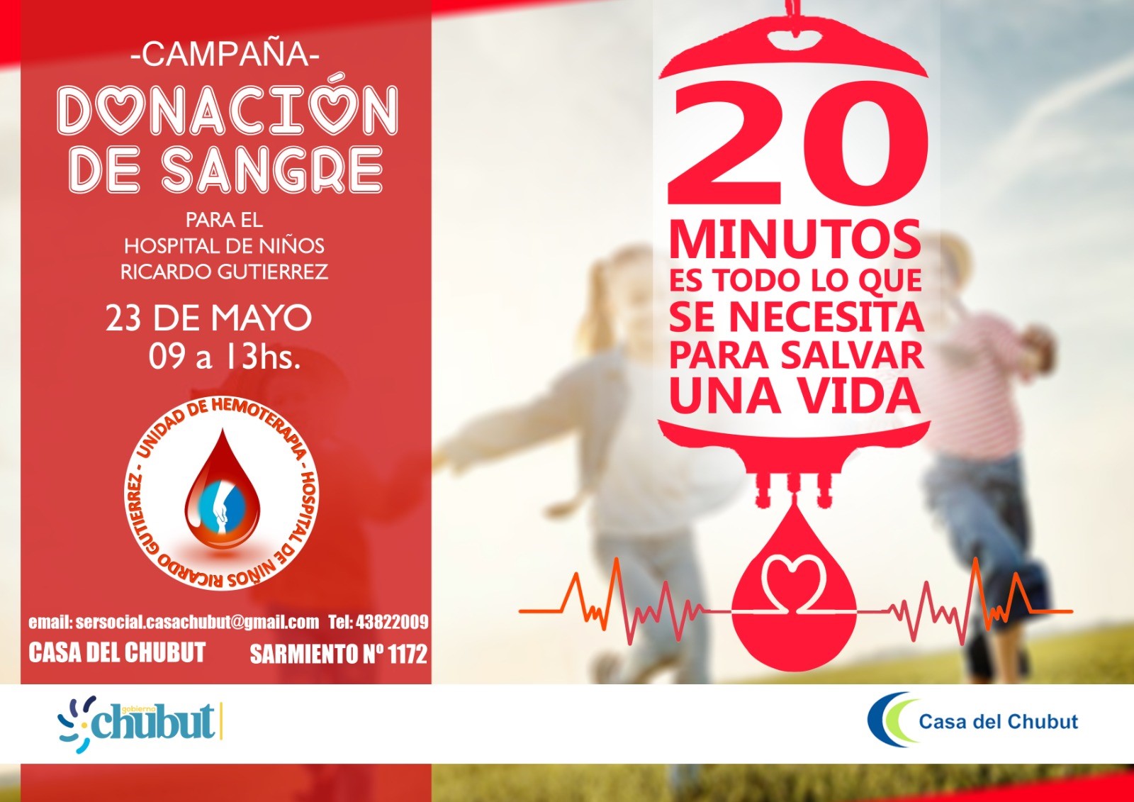El martes de 9 a 13 horas se llevará a cabo en la Casa del Chubut en Buenos Aires una nueva Campaña de Donación de Sangre, en esta ocasión junto al Hospital General de Niños Dr. Ricardo Gutiérrez, dedicado desde 1875 al cuidado de los niños y sus familias, que cuenta con más de 50 especialidades pediátricas.