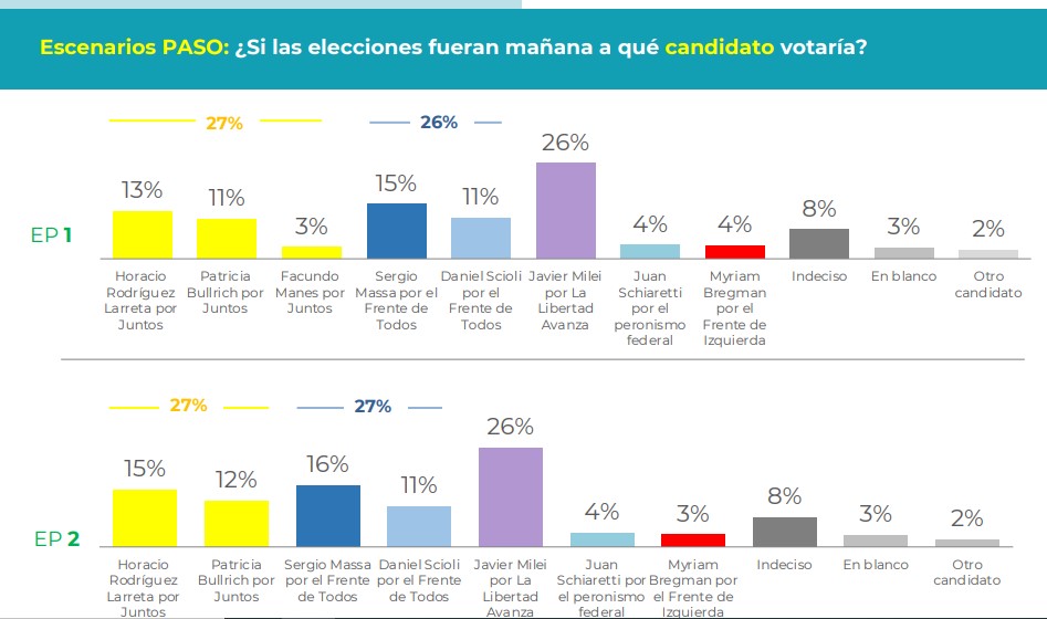 En el segundo escenario PASO que se analizó, sin postulantes de la UCR, Rodríguez Larreta ganaría la interna de JxC con el 15% del total de los votos en las PASO y Bullrich sacaría el 12%. En este caso, JxC centralizaría el 27% del total de los votos, al igual que el Frente de Todos, y La Libertad Avanza quedaría en el tercer lugar, con el 26%.