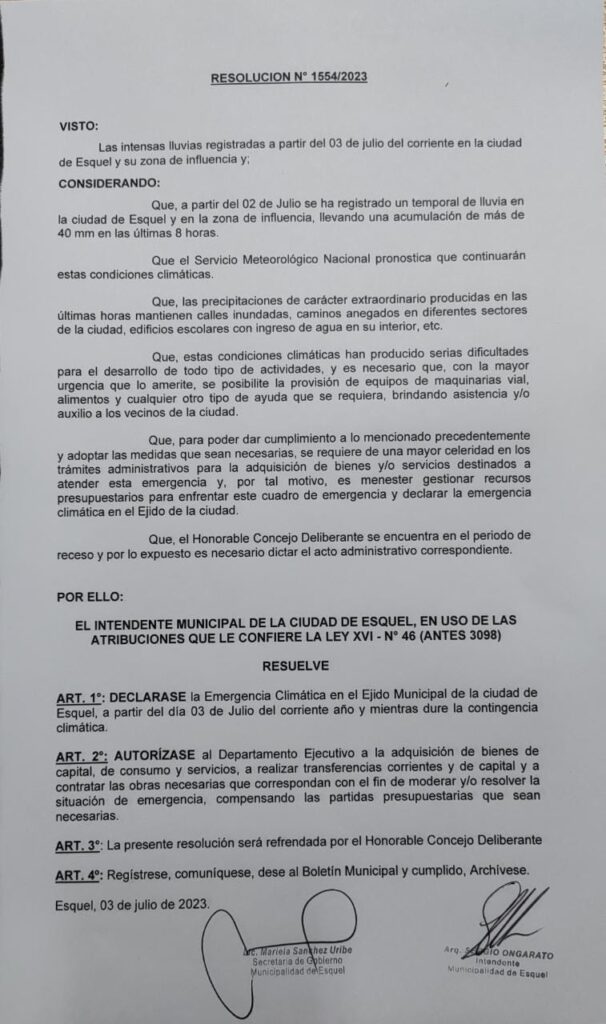 Luego de analizar la situación actual de la ciudad, el Intendente Ongarato junto al Director de Protección Civil, Sergio Caneo, el Secretario de Obras Públicas, Herman Torres, la Secretaria de Gobierno, Mariela Sánchez Uribe, la Secretaria de Desarrollo Social, Nadia Cittanti y la Secretaria de Hacienda, María Paula Neuwirth, resolvieron declarar la emergencia climática ad referéndum del Honorable Concejo Deliberante, a partir de hoy 3 de julio y hasta tanto dure la contingencia climática.