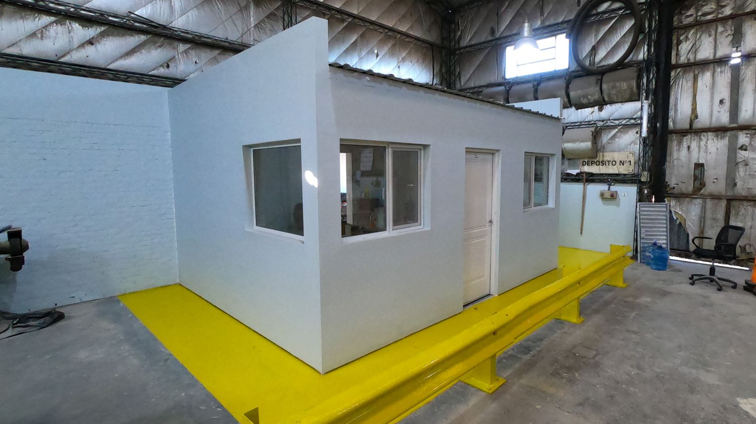 Además, se llevó a cabo un cambio de las aberturas de chapa en la oficina existente por aberturas de aluminio, mejorando así la aislación térmica y garantizando su correcta operación, teniendo en cuenta la exposición al sector costero. También, se generó una abertura en el muro para conectar el nuevo espacio con la oficina preexistente.