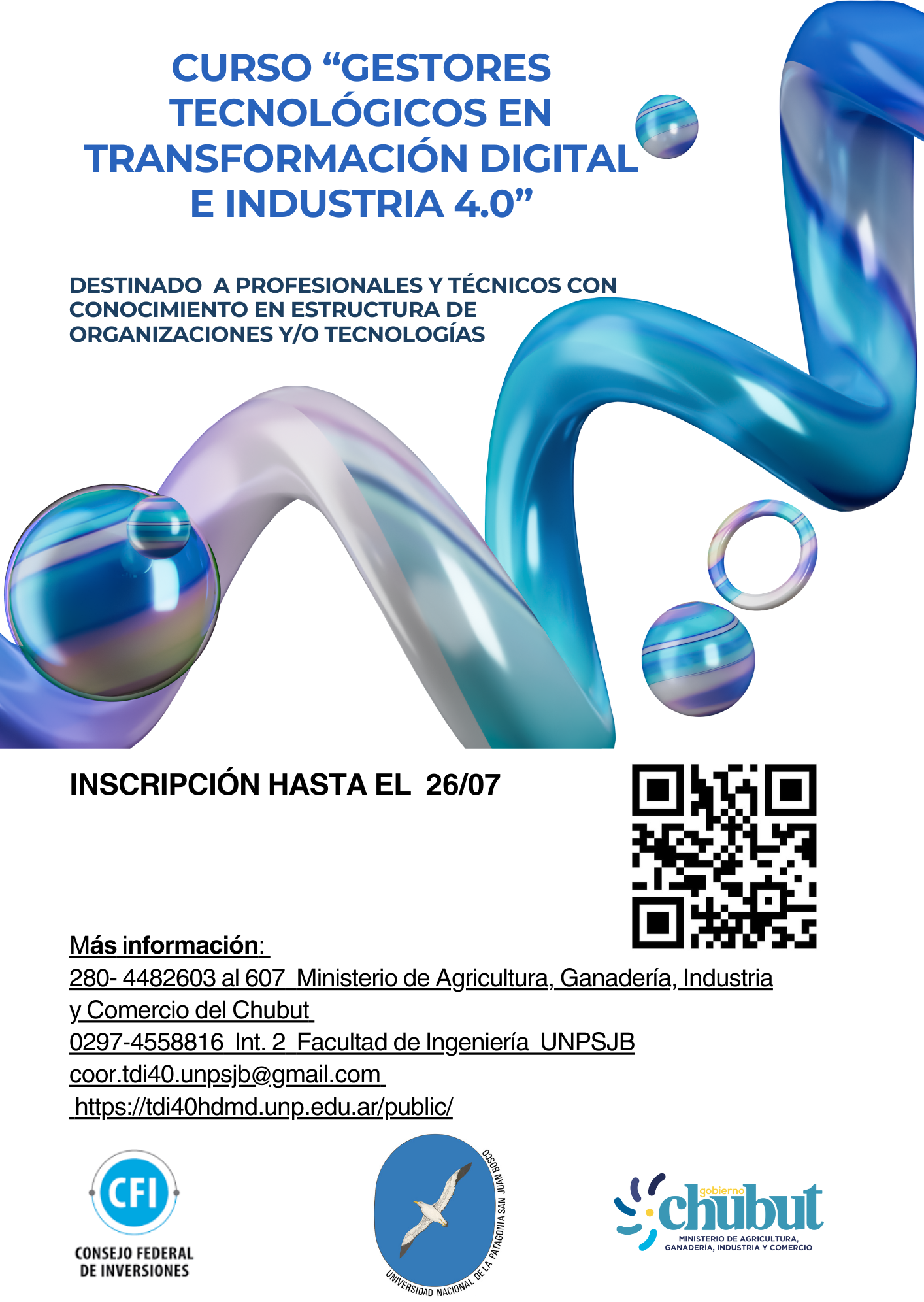 Aquellos que deseen mayor información acerca del Curso y del personal a cargo del Programa pueden comunicarse telefónicamente al 280-4482603, al 607 del Ministerio de Agricultura, Ganadería, Industria y Comercio del Chubut o al 0297-4558816 Interno 2, de 9.30 a 13.30 horas de la Facultad de Ingeniería de la UNPSJB. También pueden hacerlo a través del mail coor.tdi40.unpsjb@gmail.com o bien ingresando a: https://tdi40hdmd.unp.edu.ar/public/