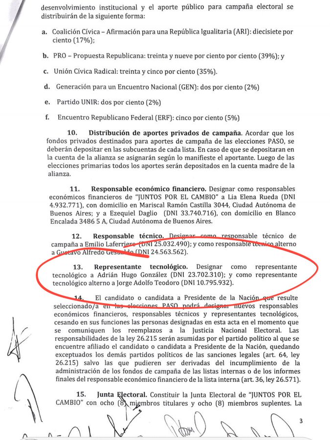 El precandidato presidencial, que competirá con el ministro de Economía Sergio Massa, acompañó su publicación con una imagen del acta constitutiva de la alianza Juntos por el Cambio a nivel nacional, que en su punto 13 establece que Teodoro será el “responsable tecnológico alterno” de ese espacio.